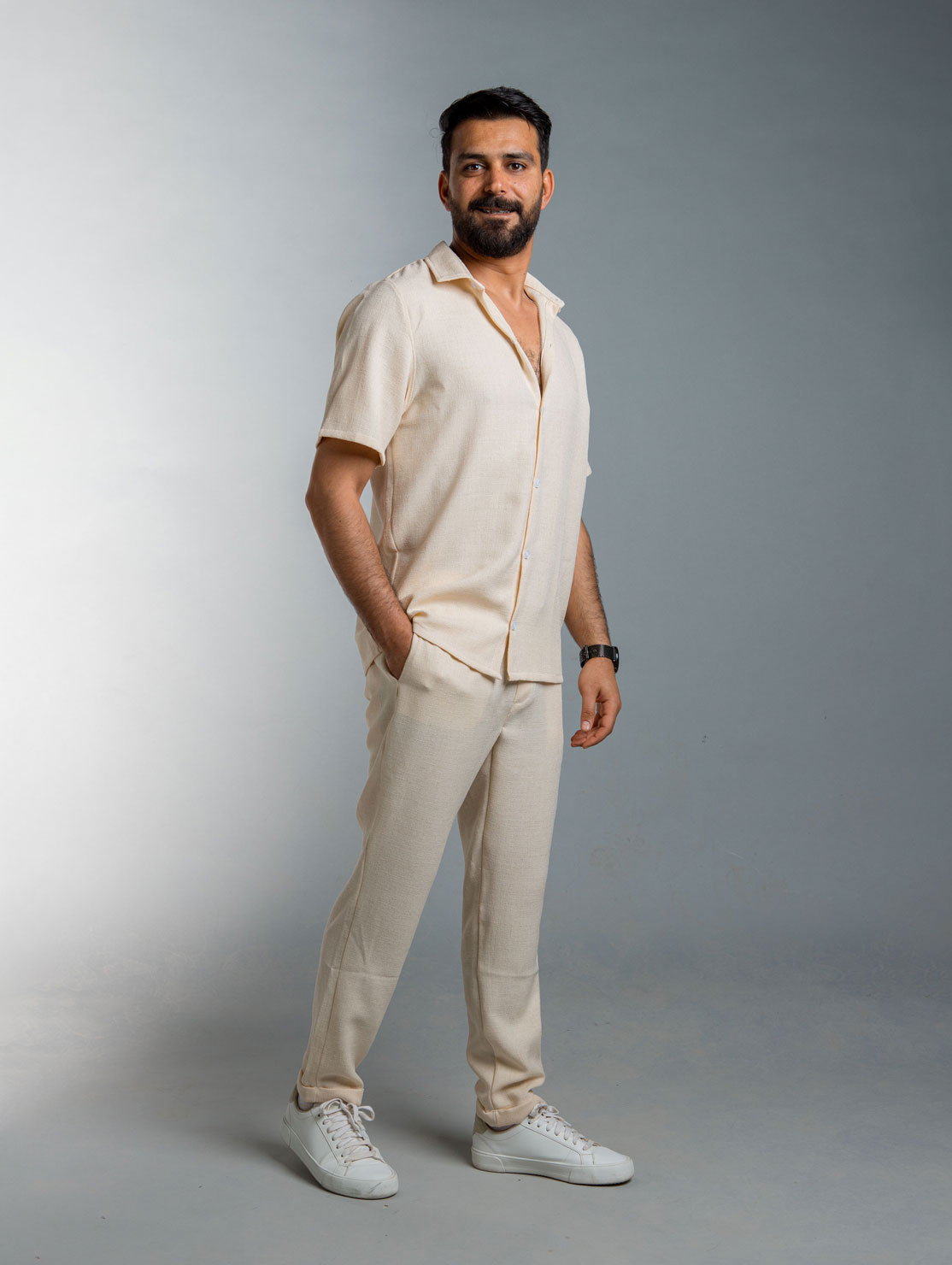 Beige Set Beige Set lightweight , made from a high-crepe natté fabric, blends 55% cotton, 45% linen and 5% Elastane for an effortlessly breathable and textured finish. The short-sleeve shirt features a relaxed open collar and button closure, while the matching pants offer a tailored yet comfortable fit. Designed and made in Tunisia, this set is ideal for sunny days, refined casual looks, and easy transitions from day to night. Wear it as a coordinated outfit or mix each piece with your wardrobe essentials for versatile style.