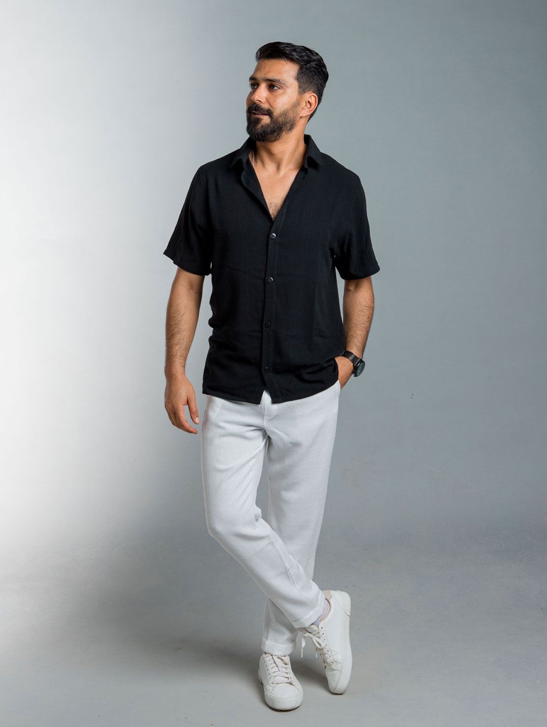 Black and White Set Black and white Set lightweight , made from a high-crepe natté fabric, blends 55% cotton and 45% linen for an effortlessly breathable and textured finish. The short-sleeve shirt features a relaxed open collar and button closure, while the matching pants offer a tailored yet comfortable fit. Designed and made in Tunisia, this set is ideal for sunny days, refined casual looks, and easy transitions from day to night. Wear it as a coordinated outfit or mix each piece with your wardrobe essentials for versatile style.